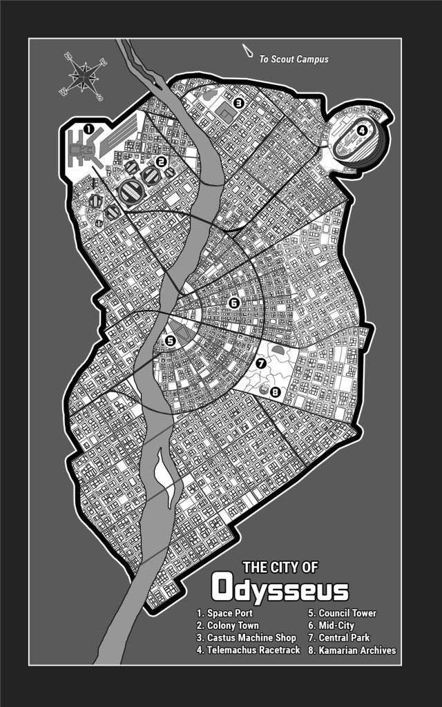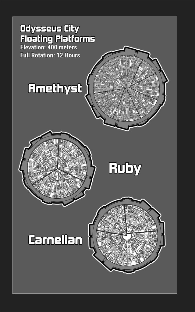 I created the maps featured in At the Threshold of the Universe, featuring the layout of Odysseus City and the three floating platforms. We learned after creating the map for Quasars that it’s easier if the author makes them because only the author fully knows the ins and outs of the world.
